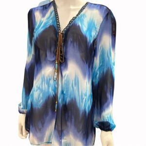 Made in France Ombré Western V Neck Top With Leather Lace up Tassel Ties