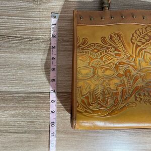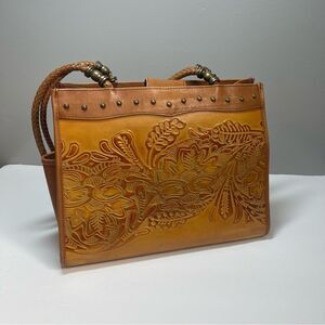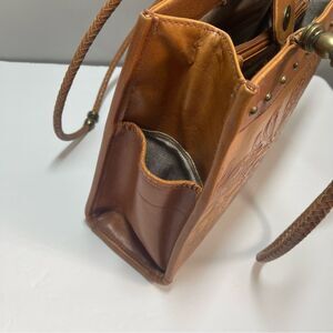 Beautiful tooled leather handbag. Has 3 inside compartments middle compartment is zipper closure. Perfect for weekend wear, work wear, casual wear, everyday wear. Has signs of wear. Black marker mark on bottom unable to remove. Minor part of handle leather weaving part coming undone. Please see photos for reference.