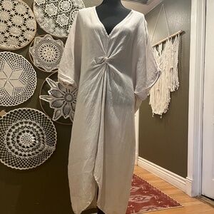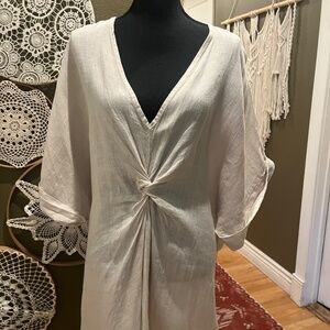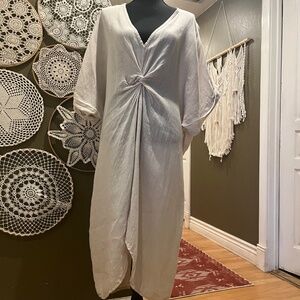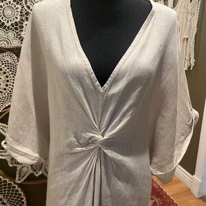 Beautiful and effortless 100% linen dress crafted in Italy. Features a soft neutral beige tone with a flattering V-neckline, dolman sleeves, and an elegant front twist detail that drapes beautifully. Lightweight and breathable, perfect for warm-weather styling or a relaxed coastal look.