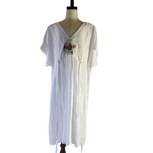 Pre-owned good condition. This effortlessly chic 100% linen tunic top is made in Italy and features a relaxed, oversized fit with a flattering V-neckline. The standout detail is the beautifully embroidered bee design at the chest, adding a unique and artistic touch. Lightweight and breathable, this top is perfect for spring and summer styling — whether worn as a tunic with leggings or a beach cover-up. 35’ inches long, 20’ wide. Embroidery Bee 4x4 inches & lightweight Boho top. sorry of wrinkles. Soaked in Oxi- clean, hang dry.