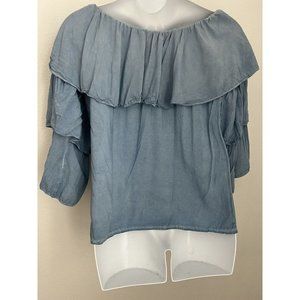 Made in Italy Blue Viscose Ruffled On Off Shoulder Blouse One Size. In excellent Preowned condition. I think I wore this just. Handful of times. One size. Measurements are in pictures. I appreciate your business and strive for a five star rating. Please feel free to message me with questions.