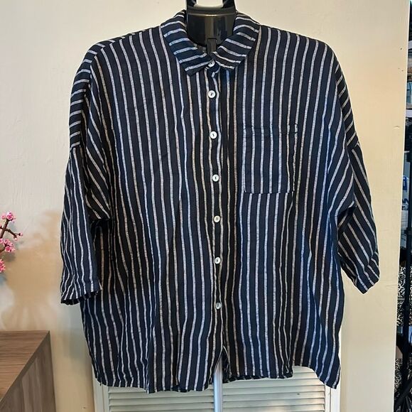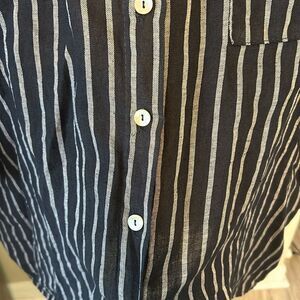 Made in Italy Blue White Striped Half 3/4 Sleeve Button Up Shirt the material tag is cut out but feels and looks like linen I wore as a beach cover up super cute Aprox measurements pit to pit 28 length 27 half sleeve I’m assuming it’s woman’s but please refer to measurements before purchase Always open to offers bundle and save more! Always fast shipping!