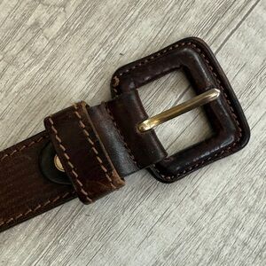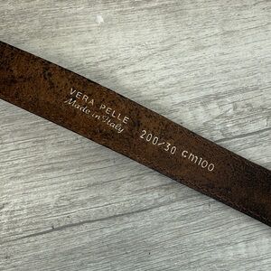 In very good used condition. Beautiful darker brown leather belt that is made in Italy. Beautiful stitching. The buckle is leather wrapped. Width is 1 inch and length is 33.5 inches in total length with the holes starting at 25.5 inches and ending at 30.5 inches.