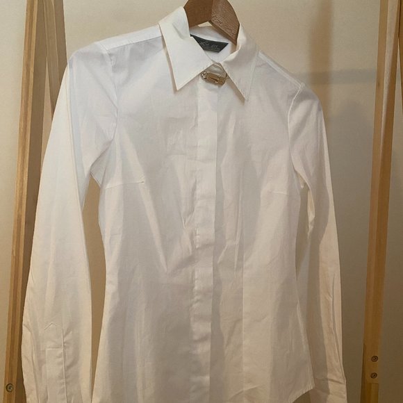 Rare women's Cesare Paciotti button down. Made in Italy. Princess seams in front and back - fitted. Dagger detail on the buttons. Never worn - too small for me in shoulders, but I loved the idea of the dagger at the neck and kept it. No stains / wear.