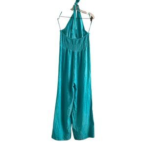 * Made in Italy Linen Halter Jumpsuit Size M Wide Leg Open Back Teal Beachy Summer