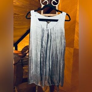 This beautiful and flowy 100% silk overlay tunic tank top is great alone or layered with your favorite jacket. It is a gorgeous blue gray with a 95% Viscose/5% Elastane lining. Great dressed up or down!