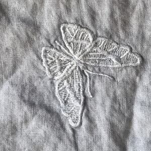 Loose Fit Short Sleeve Blue Pure Linen Blouse with Butterfly Images. Length 29" and Chestt28". Item 9