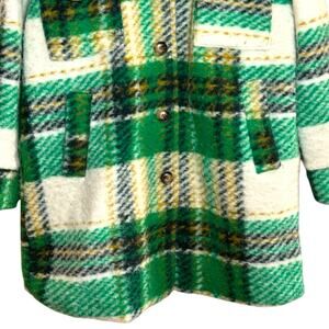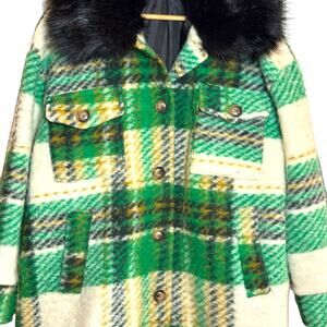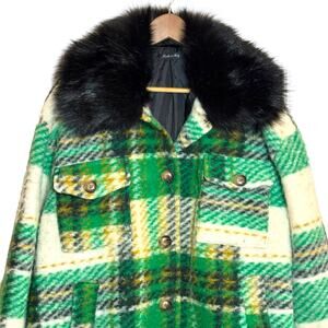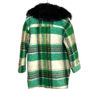 Made in Italy Wool Blend Green Plaid Button Up Coat with Faux Fur Collar