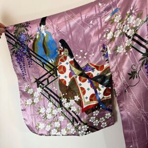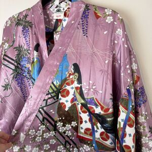 Wrap yourself in art with this stunning lavender kimono-style robe made in Japan. Featuring an intricate print of a Heian-era couple surrounded by cherry blossoms, bamboo, and wisteria, this silky piece is perfect as a loungewear statement, photoshoot piece, or luxe layering robe.
