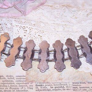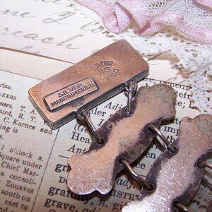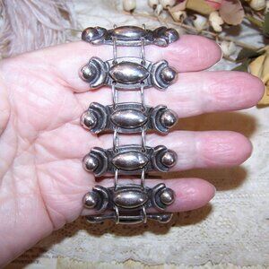From Mexico and dating to the 1950s or so. here's a stunning Sterling Silver (hallmarked as pictured) bracelet,. In a "coffee bean and berry-like" design, the length of the piece is 8" with a wearable of 7.85". Width of the links is 1.5". Weight is 94.6 grams - that's over 3 ounces of silver!! Closure is a "tongue in" and while the closure goes in easily and is quite secure, to take apart requires a bit of fiddling. With all the large oval jump rings holding the piece together, you certainly could add a ton of charms to make this a ONE OF A KIND piece of jewelry.