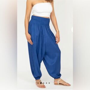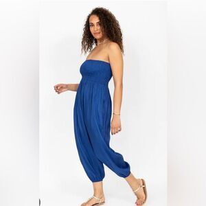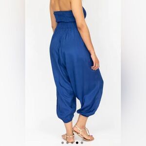 Can be worn at waist as pants or pulled up to wear as a strapless cropped jumpsuit. These are a beautiful royal blue with purple threading throughout that shows in the light.