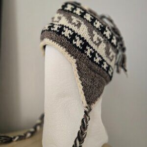 Handmade wool knitted tied bonnet. Made in Nepal.
