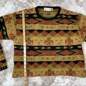southwestern sweater, geometric knit pullover, aztec pattern sweater, tribal print jumper, earthy tones sweater, mustard yellow and rust sweater, boho cozy sweater, retro fall fashion, crewneck knit top, warm patterned pullover, 90s style sweater, wool blend sweater, casual winter outfit, rustic color block sweater, Native-inspired design sweater