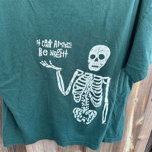 T-Shirt in green is designed for unisex adults and features a graphic print with cosmic, skeleton, and astronomy themes. Made from soft fabric, it offers comfort and is suitable for all seasons. The crew neck design makes it ideal for casual outings or relaxed gatherings. This regular-sized, small T-shirt is pre-owned.
