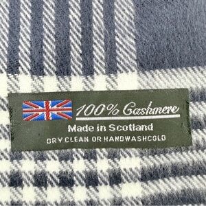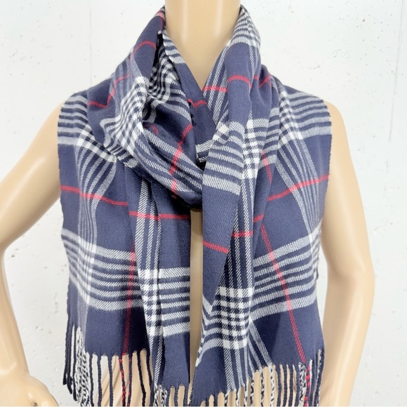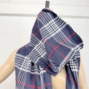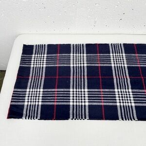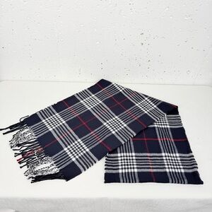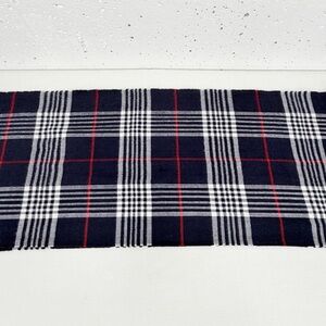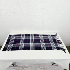 Made in Scotland Scottish Cashmere Navy Blue White and Red Plaid Fringe Scarf in good preowned condition no pilling. 13.5 x 68”