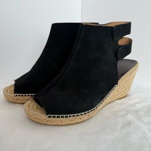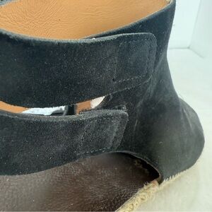 Step out in style with these elegant black suede wedge sandals. Perfect for any occasion, these shoes offer both comfort and sophistication. Featured Velcro closures.