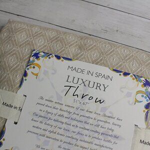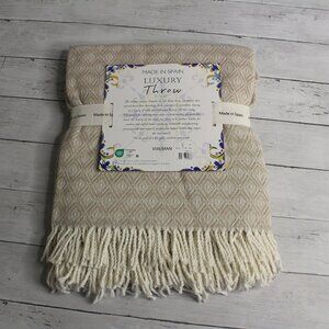 Made in Spain Throw Blanket Tan Cream with Fringe Cotton Blend