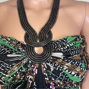SKY brand Made in USA black and chain detail halter style black printed top stretch SZ SM