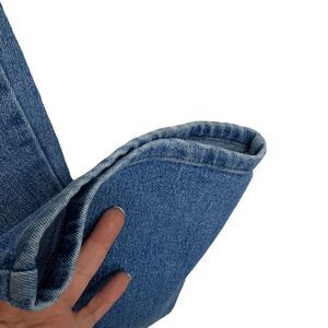 These vintage jeans were made in the USA. They have a high rise and straight leg fit. These jeans zip up the front and have front shallow pockets made like trouser back pockets. These blue jeans stretch for movement. They are made of 96% cotton and 4% spandex. These jeans have a lighter couple stripes on the front right leg shown in pictures.