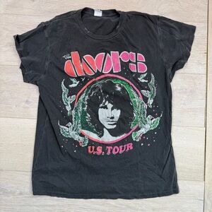 Stylish graphic tee featuring The Doors design. Black with pink and green accents.