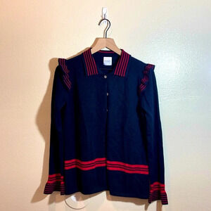 Madeleine Thompson 100% Cashmere Cardigan Blue Red Striped Ruffles size Medium