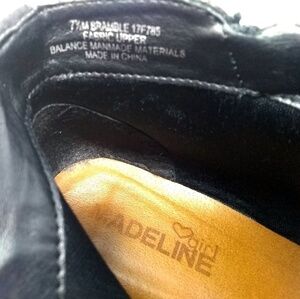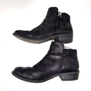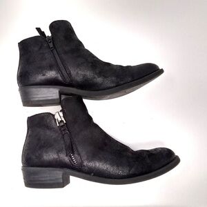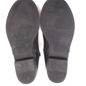 Size 7.5M. Fabric upper. Exaggerated zipper pull and a high-low design. Inside zipper Low stacked heel. In great pre-owned condition.