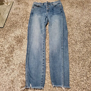 Madewell 10" High Rise skinny jeans. These are in the Cordova wash which is medium blue with a button front. They do have some wear in the crotch that can be seen in the photos. They are a size 26 and measure as follows: waist-26 inches, hips-28 inches, rise-10 inches, and inseam-25 inches.
