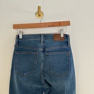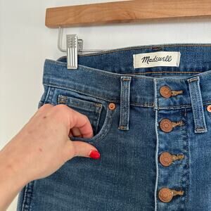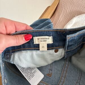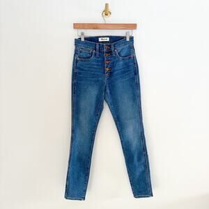 Details: Madewell 10" High-Rise Skinny Jeans in Dewitt Wash Button-Front Denim - Size: 25- Color: Blue- Material: 57% cotton, 35% lyocell, 6% polyester, 2% elastane- Features: Made of soft-to-the-touch denim woven with TENCEL™ lyocell, these 10" high-rise button-front skinny jeans feel like stealth yoga pants.