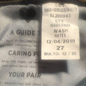 Front rise: 10"; inseam: 28 1/2"; leg opening for size 25: 9 3/4".
