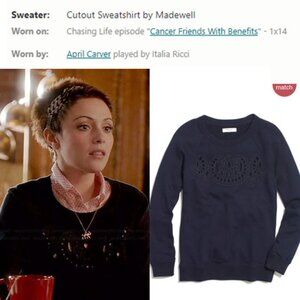 Worn on TV. April Carver (played by Italia Ricci) on Chasing Life on ABC Family was spotted wearing this navy cutout sweater on Chasing Life on episode 'Cancer Friends With Benefits' (1x14). April's Sweater is the Cutout Sweatshirt by Madewell.