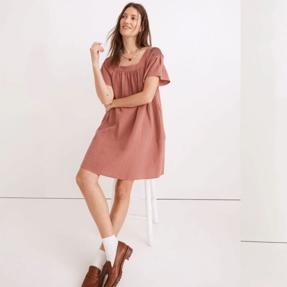 Madewell 100% Cotton Gauze Lightspun Butterfly Square Neck Mini Pink Dress Sz XS