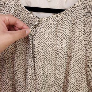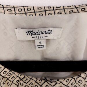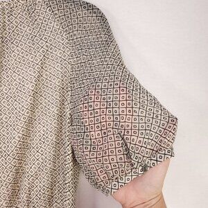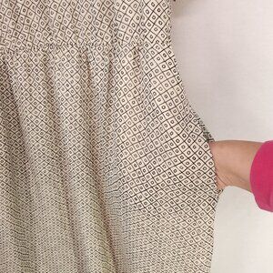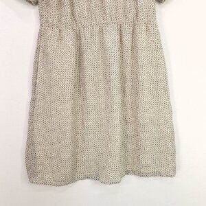 Chic Madewell 100% silk mini dress in beige, size 6. Features a baby doll style with an elastic waist, sheer sleeves, and handy pockets. Adorned with a unique geometric pattern.