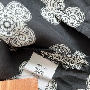 Beautiful, soft 100% black silk with white geometric pattern. Trapeze silhouette with v-neck and spaghetti straps. Pleated at top of v-neckline. Split side hems. Breezy, flowy, and perfect for dressing up or layering. Style with slacks and heels for an elevated look, or with a blazer for business casual. No discernible flaws! A gorgeous preloved top for professional wear or dressy summer occasions!