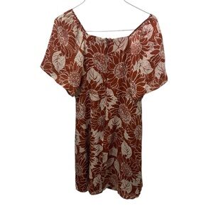 100% silk. Terracotta and white sunflower print. Tie detail to chest. Hidden back zipper closure. Lined. Short sleeves.