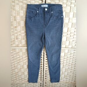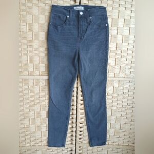 Flattering and vintage-inspired, these Madewell 11" High-Rise Skinny Jeans in the Levin wash (gray) are part of the Retro Pocket Edition, featuring contrast stitching and back patch pockets for a cool throwback look. Size 25 Petite, ideal for petites seeking a true high rise and a cropped fit. Comfy, sculpting stretch denim that moves with you. Perfect for dressing up or down year-round.