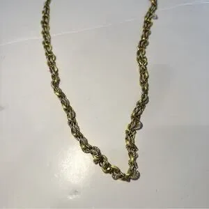 Brushed gold tone chain with woven black cord. Great addition to layered look.