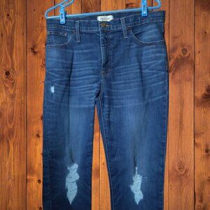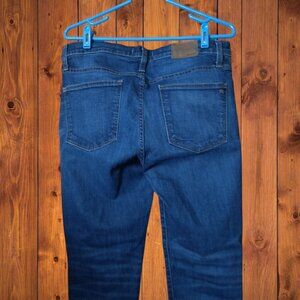 Madewell 9 inch High-Rise Skinny jeans are a women's size 32. They have zip fly, button closure, belt loops and front and back pockets. They are distressed with raw hem.