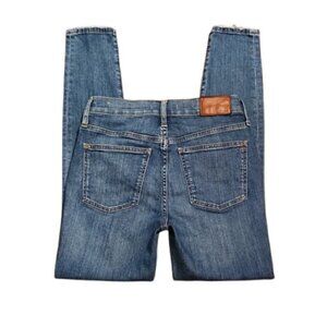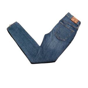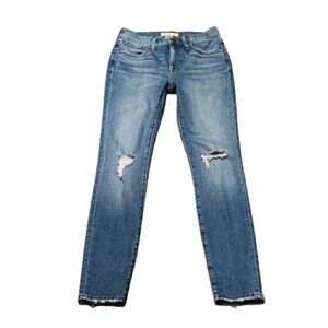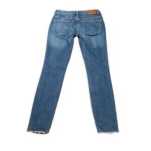 Stonewashed mid-rise skinny jeans. Single button and zipper front closure. Sanded detail. Whiskering accents. Distressed detail on the hem. Five pockets.