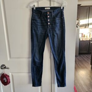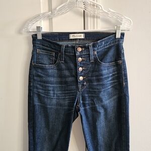 Madewell 9" Mid-Rise Skinny Jeans in Hayes Wash: Button-Front Edition. Women's size 26. Preowned in good condition. Lean and legs-for-days sexy, these 9" mid-rise skinny jeans come in a deep indigo with a broken-in vibe.