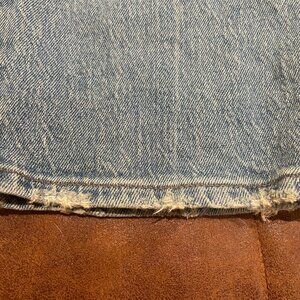 These are in great condition. There is some light distressing on the front pockets and hems (see photos). There is one tiny black (ink?) stain on the back of one of the legs (see photos); it is not particularly noticeable.