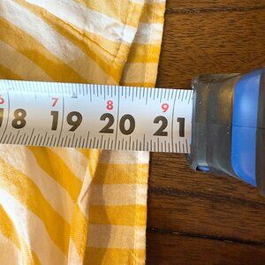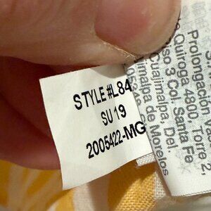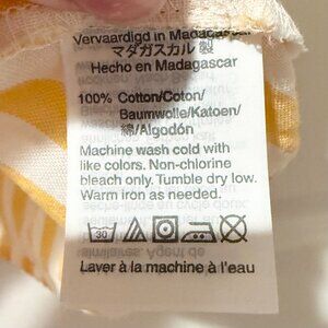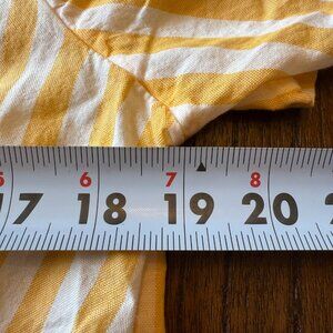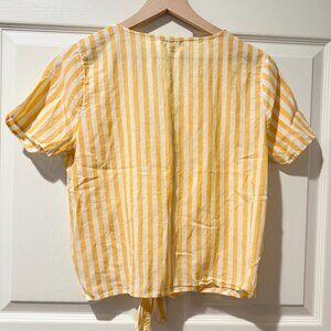 Easy, breezy lightweight top perfect for travel or warmer seasons. Yellow and white vertical stripes with exposed, covered buttons and tie front. Deep v-neck with no collar. 100% Cotton.