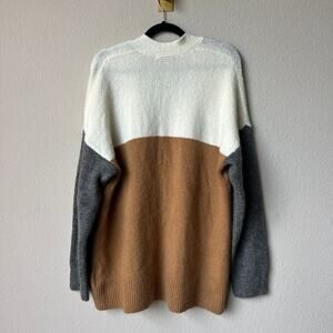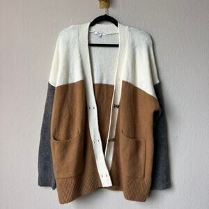 Madewell 'Allston' double button tan, cream and gray colorblock cardigan sweater. Made of soft and lofty yarn, this colorblock cardigan comes in an easy layering length, with patch pockets and cool double buttons down the front. Slightly oversized fit. Machine washable. In excellent condition. Size large - 23.5" pit to pit; 30" in length.