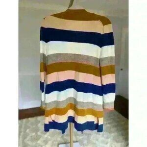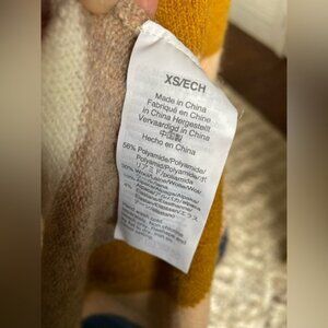 This Madewell cardigan features warm-toned stripes, a soft alpaca-blend knit, and convenient front pockets. Perfect for layering during cooler seasons, it combines casual comfort with timeless style.