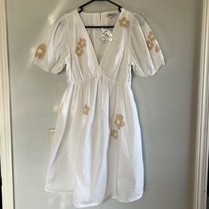 Pretty and perfectly poofy, this shirred-waist dress has dramatic puffed sleeves and a cutout back. Coming in crinkled cotton poplin, it's embroidered with floral appliqués all over.