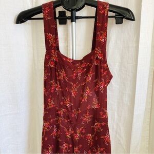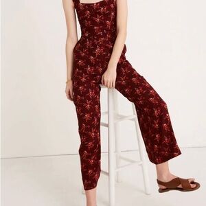Madewell apron bow back jumpsuit in a red floral windowbox print. An easy wide-leg jumpsuit with a floral print and undeniably pretty back detail—it ties in a bow above a peekaboo cutout. Try it over a tee or wear it solo.