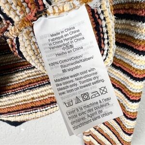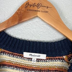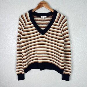 This Madewell Arden V-Neck Pullover features a bold, chunky knit in a cropped silhouette with retro-inspired horizontal stripes in tan, brown, pink, cream, and navy. Crafted from 100% cotton, it’s cozy yet breathable—perfect for layering during fall or spring. Slightly cropped with ribbed cuffs and hem for a snug fit. Size Small.