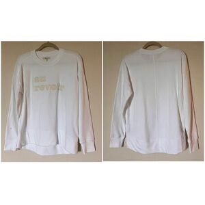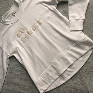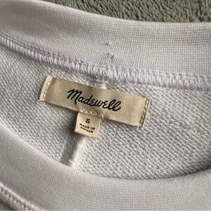 Good-to-fair used condition. Au Revoir Sweatshirt by Madewell in white with cream detailing. Cozy Parisian aesthetic. Pullover sweatshirt with fuzzy embroidered "au revoir" text at front , see video. Long sleeves and relaxed, easy silhouette. Banded trims. 100% cotton. Note: moderate wear throughout, with a few marks/discoloration and spots, see photos. Size small, see photos for measurements.