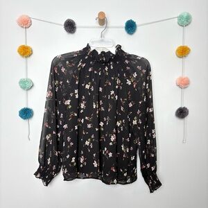 Black blouse with beautiful floral design. Buttons near the back of neck. Smocked neckline. Size small, true to size. Great condition!