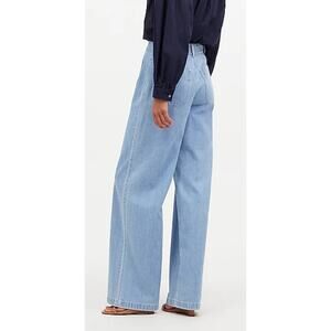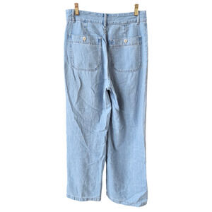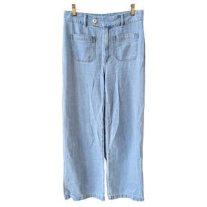 High waist, wide leg, patch pocket. 100% cotton, lightweight denim. Light wash. these are NWT but seem to have a few marks on them that will likely come out in wash. one small mark on front zipper area and one small area by back pocket. Also looks like a small pen mark on front thigh area. Runs big, check measurements.