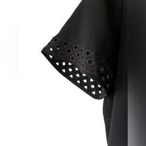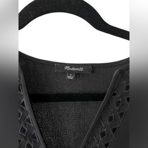 Madewell Ballad Tunic Dress Black Short Sleeve Mini Dress Size 6. V Neck dress with geometric pattern cut out design along neckline and sleeves. Item is in great condition with no visible signs of wear.